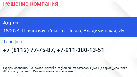 Решение, компания по адресу 180024, Псковская область, Псков, Владимирская, 7Б в дальнейшем Организация, размещена в следующих категориях: