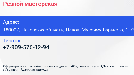 Резной, мастерская по адресу 180007, Псковская область, Псков, Максима Горького, 1 к3 в дальнейшем Организация, размещена в следующих категориях:
