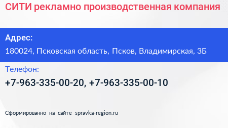 СИТИ, рекламно-производственная компания по адресу 180024, Псковская область, Псков, Владимирская, 3Б в дальнейшем Организация, размещена в следующих категориях: