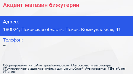 Акцент, магазин бижутерии по адресу 180024, Псковская область, Псков, Коммунальная, 41 в дальнейшем Организация, размещена в следующих категориях: