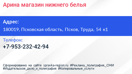 Арина, магазин нижнего белья по адресу 180019, Псковская область, Псков, Труда, 54 к1 в дальнейшем Организация, размещена в следующих категориях: