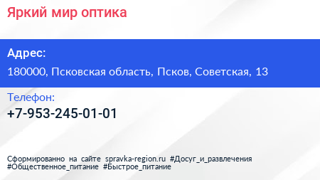 Яркий мир, оптика по адресу 180000, Псковская область, Псков, Советская, 13 в дальнейшем Организация, размещена в следующих категориях: