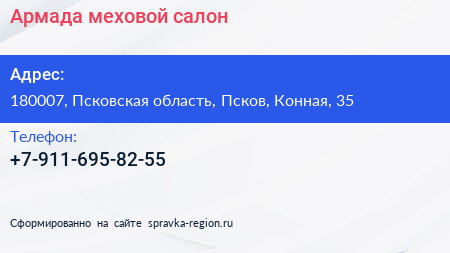 Армада, меховой салон по адресу 180007, Псковская область, Псков, Конная, 35 в дальнейшем Организация, размещена в следующих категориях: