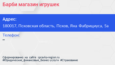 Барби, магазин игрушек по адресу 180017, Псковская область, Псков, Яна Фабрициуса, 5а в дальнейшем Организация, размещена в следующих категориях: