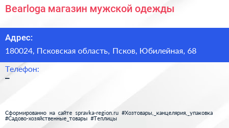 Bearloga, магазин мужской одежды по адресу 180024, Псковская область, Псков, Юбилейная, 68 в дальнейшем Организация, размещена в следующих категориях: