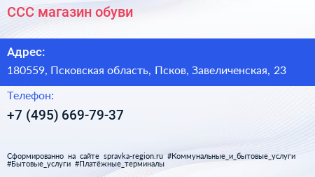 CCC, магазин обуви по адресу 180559, Псковская область, Псков, Завеличенская, 23 в дальнейшем Организация, размещена в следующих категориях: