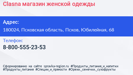 Clasna, магазин женской одежды по адресу 180024, Псковская область, Псков, Юбилейная, 68 в дальнейшем Организация, размещена в следующих категориях:
