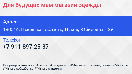 Для будущих мам, магазин одежды по адресу 180016, Псковская область, Псков, Юбилейная, 89 в дальнейшем Организация, размещена в следующих категориях: