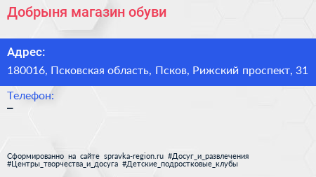 Добрыня, магазин обуви по адресу 180016, Псковская область, Псков, Рижский проспект, 31 в дальнейшем Организация, размещена в следующих категориях: