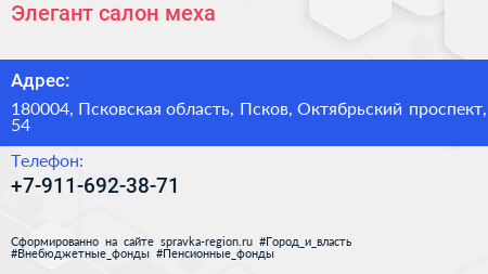 Элегант, салон меха по адресу 180004, Псковская область, Псков, Октябрьский проспект, 54 в дальнейшем Организация, размещена в следующих категориях: