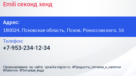 Emili, секонд-хенд по адресу 180024, Псковская область, Псков, Рокоссовского, 16 в дальнейшем Организация, размещена в следующих категориях:
