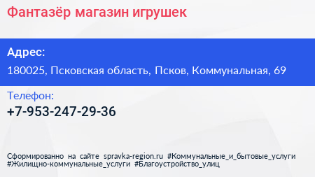 Фантазёр, магазин игрушек по адресу 180025, Псковская область, Псков, Коммунальная, 69 в дальнейшем Организация, размещена в следующих категориях: