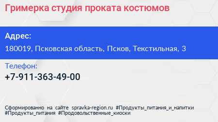 Гримерка, студия проката костюмов по адресу 180019, Псковская область, Псков, Текстильная, 3 в дальнейшем Организация, размещена в следующих категориях:
