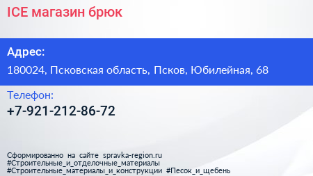ICE, магазин брюк по адресу 180024, Псковская область, Псков, Юбилейная, 68 в дальнейшем Организация, размещена в следующих категориях: