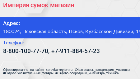 Империя сумок, магазин по адресу 180024, Псковская область, Псков, Кузбасской Дивизии, 19 в дальнейшем Организация, размещена в следующих категориях: