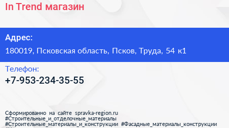 In Trend, магазин по адресу 180019, Псковская область, Псков, Труда, 54 к1 в дальнейшем Организация, размещена в следующих категориях: