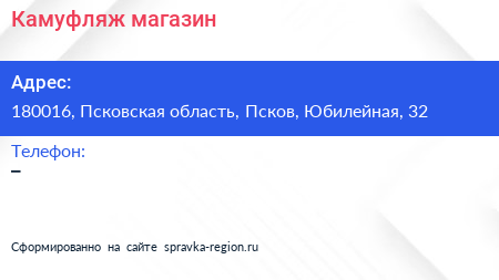 Камуфляж, магазин по адресу 180016, Псковская область, Псков, Юбилейная, 32 в дальнейшем Организация, размещена в следующих категориях: