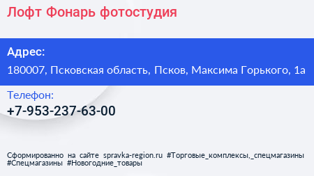 Лофт Фонарь, фотостудия по адресу 180007, Псковская область, Псков, Максима Горького, 1а в дальнейшем Организация, размещена в следующих категориях: