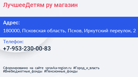 ЛучшееДетям.ру, магазин по адресу 180000, Псковская область, Псков, Иркутский переулок, 2 в дальнейшем Организация, размещена в следующих категориях: