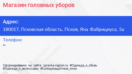 Магазин головных уборов по адресу 180017, Псковская область, Псков, Яна Фабрициуса, 5а в дальнейшем Организация, размещена в следующих категориях: