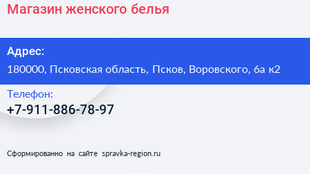 Магазин женского белья по адресу 180000, Псковская область, Псков, Воровского, 6а к2 в дальнейшем Организация, размещена в следующих категориях: