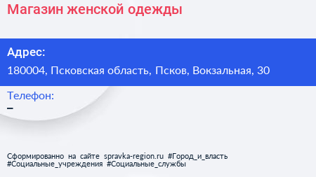 Магазин женской одежды по адресу 180004, Псковская область, Псков, Вокзальная, 30 в дальнейшем Организация, размещена в следующих категориях: