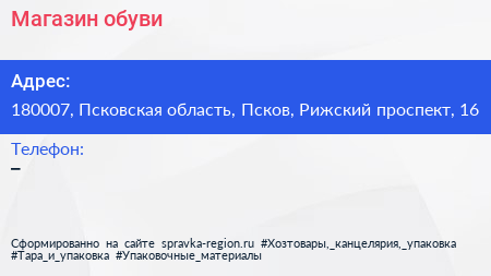 Магазин обуви по адресу 180007, Псковская область, Псков, Рижский проспект, 16 в дальнейшем Организация, размещена в следующих категориях: