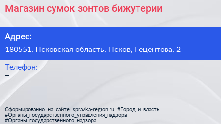 Магазин сумок, зонтов, бижутерии по адресу 180551, Псковская область, Псков, Гецентова, 2 в дальнейшем Организация, размещена в следующих категориях: