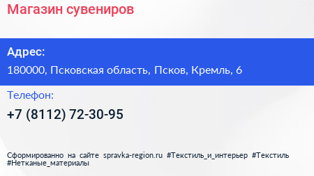 Магазин сувениров по адресу 180000, Псковская область, Псков, Кремль, 6 в дальнейшем Организация, размещена в следующих категориях: