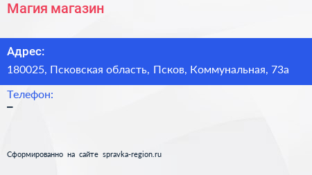 Магия, магазин по адресу 180025, Псковская область, Псков, Коммунальная, 73а в дальнейшем Организация, размещена в следующих категориях: