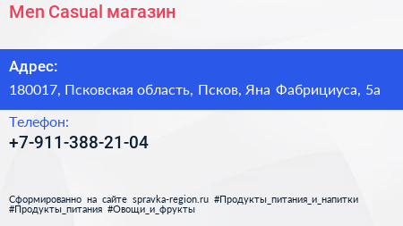 Men Casual, магазин по адресу 180017, Псковская область, Псков, Яна Фабрициуса, 5а в дальнейшем Организация, размещена в следующих категориях: