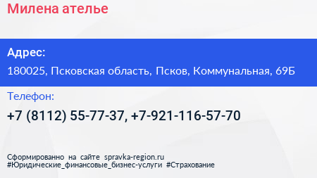 Милена, ателье по адресу 180025, Псковская область, Псков, Коммунальная, 69Б в дальнейшем Организация, размещена в следующих категориях: