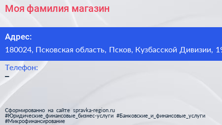 Моя фамилия, магазин по адресу 180024, Псковская область, Псков, Кузбасской Дивизии, 19 в дальнейшем Организация, размещена в следующих категориях: