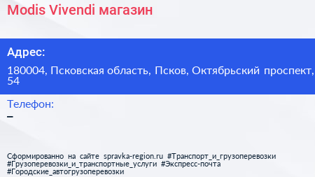 Modis Vivendi, магазин по адресу 180004, Псковская область, Псков, Октябрьский проспект, 54 в дальнейшем Организация, размещена в следующих категориях: