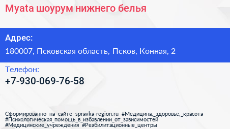 Myata, шоурум нижнего белья по адресу 180007, Псковская область, Псков, Конная, 2 в дальнейшем Организация, размещена в следующих категориях: