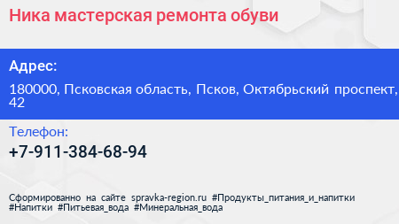 Ника, мастерская ремонта обуви по адресу 180000, Псковская область, Псков, Октябрьский проспект, 42 в дальнейшем Организация, размещена в следующих категориях: