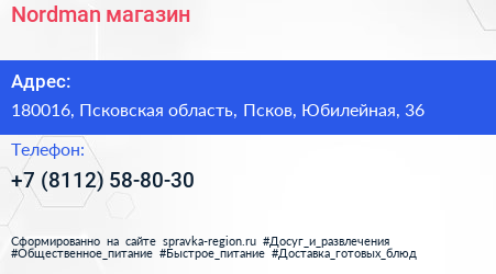 Nordman, магазин по адресу 180016, Псковская область, Псков, Юбилейная, 36 в дальнейшем Организация, размещена в следующих категориях:
