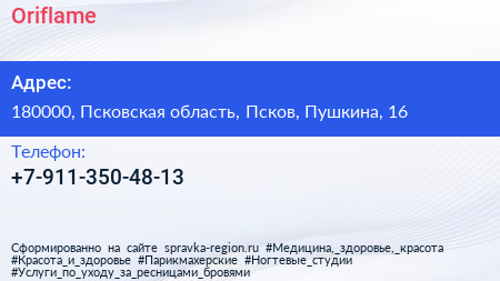 Oriflame по адресу 180000, Псковская область, Псков, Пушкина, 16 в дальнейшем Организация, размещена в следующих категориях: