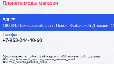 Планета моды, магазин по адресу 180024, Псковская область, Псков, Кузбасской Дивизии, 19 в дальнейшем Организация, размещена в следующих категориях: