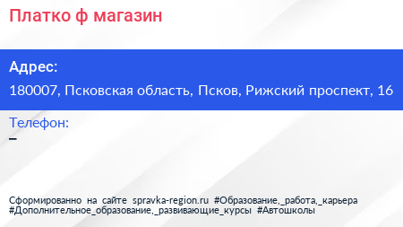 Платко`ф, магазин по адресу 180007, Псковская область, Псков, Рижский проспект, 16 в дальнейшем Организация, размещена в следующих категориях: