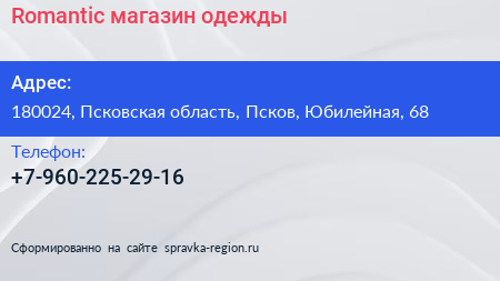 Romantic, магазин одежды по адресу 180024, Псковская область, Псков, Юбилейная, 68 в дальнейшем Организация, размещена в следующих категориях: