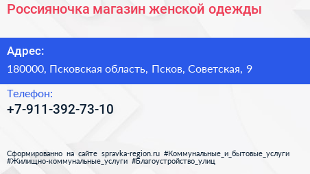 Россияночка, магазин женской одежды по адресу 180000, Псковская область, Псков, Советская, 9 в дальнейшем Организация, размещена в следующих категориях: