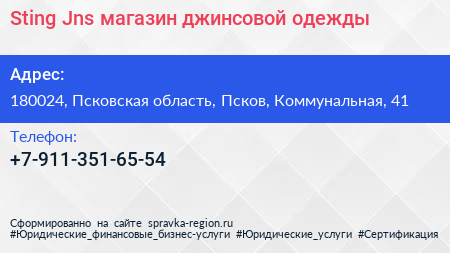 Sting Jns, магазин джинсовой одежды по адресу 180024, Псковская область, Псков, Коммунальная, 41 в дальнейшем Организация, размещена в следующих категориях: