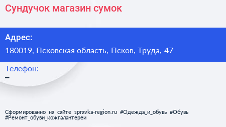 Сундучок, магазин сумок по адресу 180019, Псковская область, Псков, Труда, 47 в дальнейшем Организация, размещена в следующих категориях: