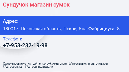 Сундучок, магазин сумок по адресу 180017, Псковская область, Псков, Яна Фабрициуса, 8 в дальнейшем Организация, размещена в следующих категориях: