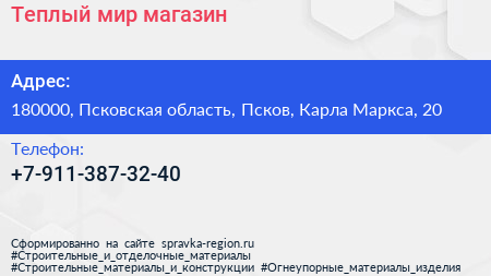 Теплый мир, магазин по адресу 180000, Псковская область, Псков, Карла Маркса, 20 в дальнейшем Организация, размещена в следующих категориях: