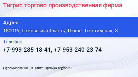 Тигрис, торгово-производственная фирма по адресу 180019, Псковская область, Псков, Текстильная, 3 в дальнейшем Организация, размещена в следующих категориях: