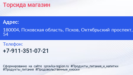 Торсида, магазин по адресу 180004, Псковская область, Псков, Октябрьский проспект, 54 в дальнейшем Организация, размещена в следующих категориях: