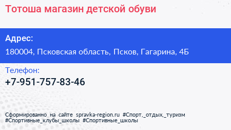 Тотоша, магазин детской обуви по адресу 180004, Псковская область, Псков, Гагарина, 4Б в дальнейшем Организация, размещена в следующих категориях: