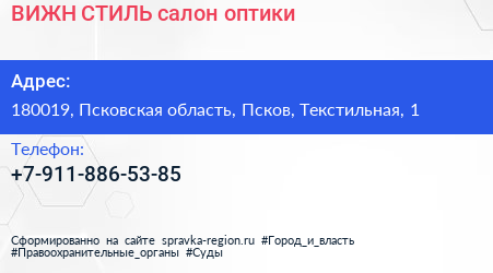 ВИЖН СТИЛЬ, салон оптики по адресу 180019, Псковская область, Псков, Текстильная, 1 в дальнейшем Организация, размещена в следующих категориях: